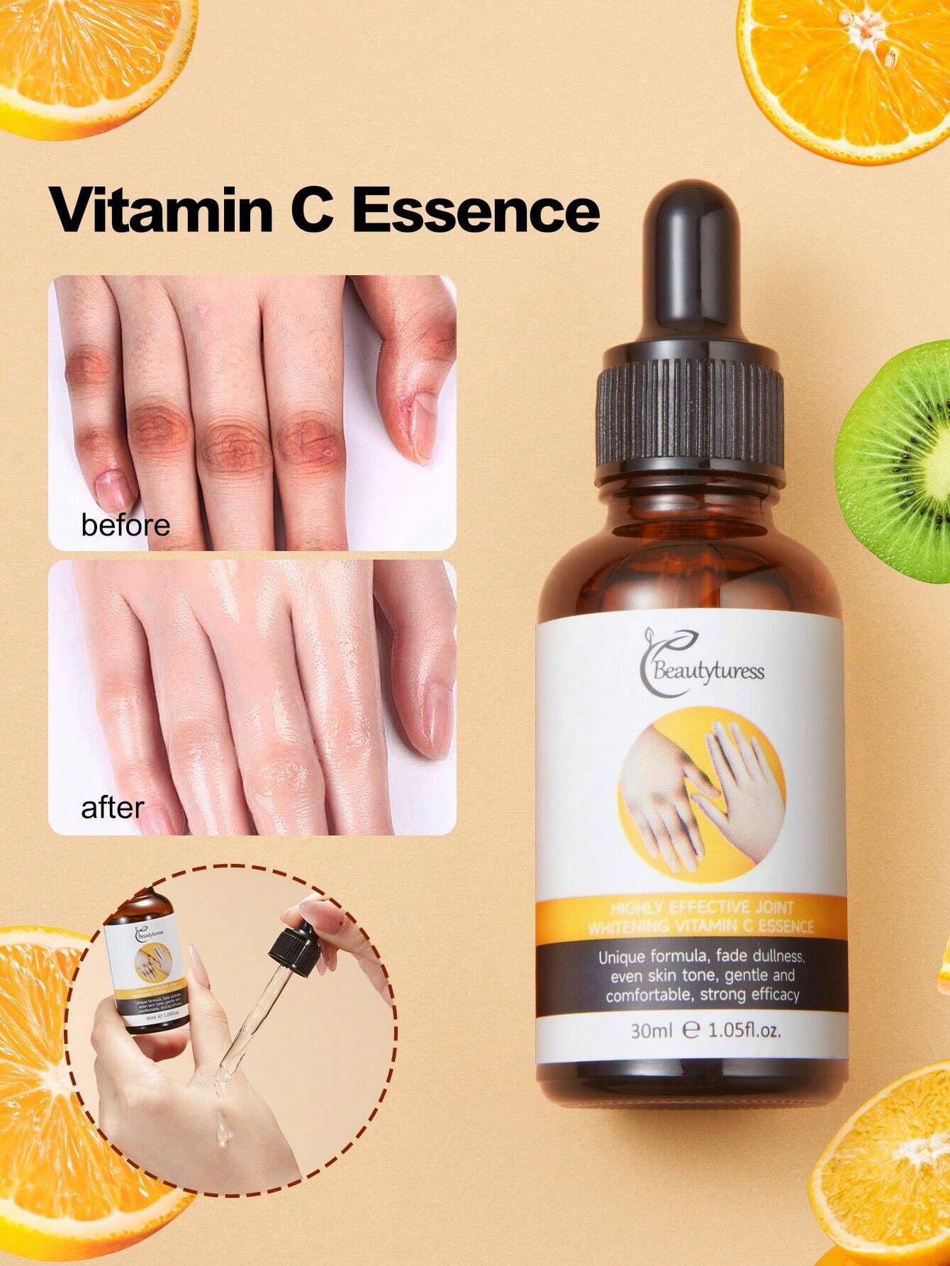 تفتيح وتوحيد لون البشرة: فيتامين سي يساعد على تفتيح البشرة وتقليل ظهور البقع الداكنة والتصبغات.
